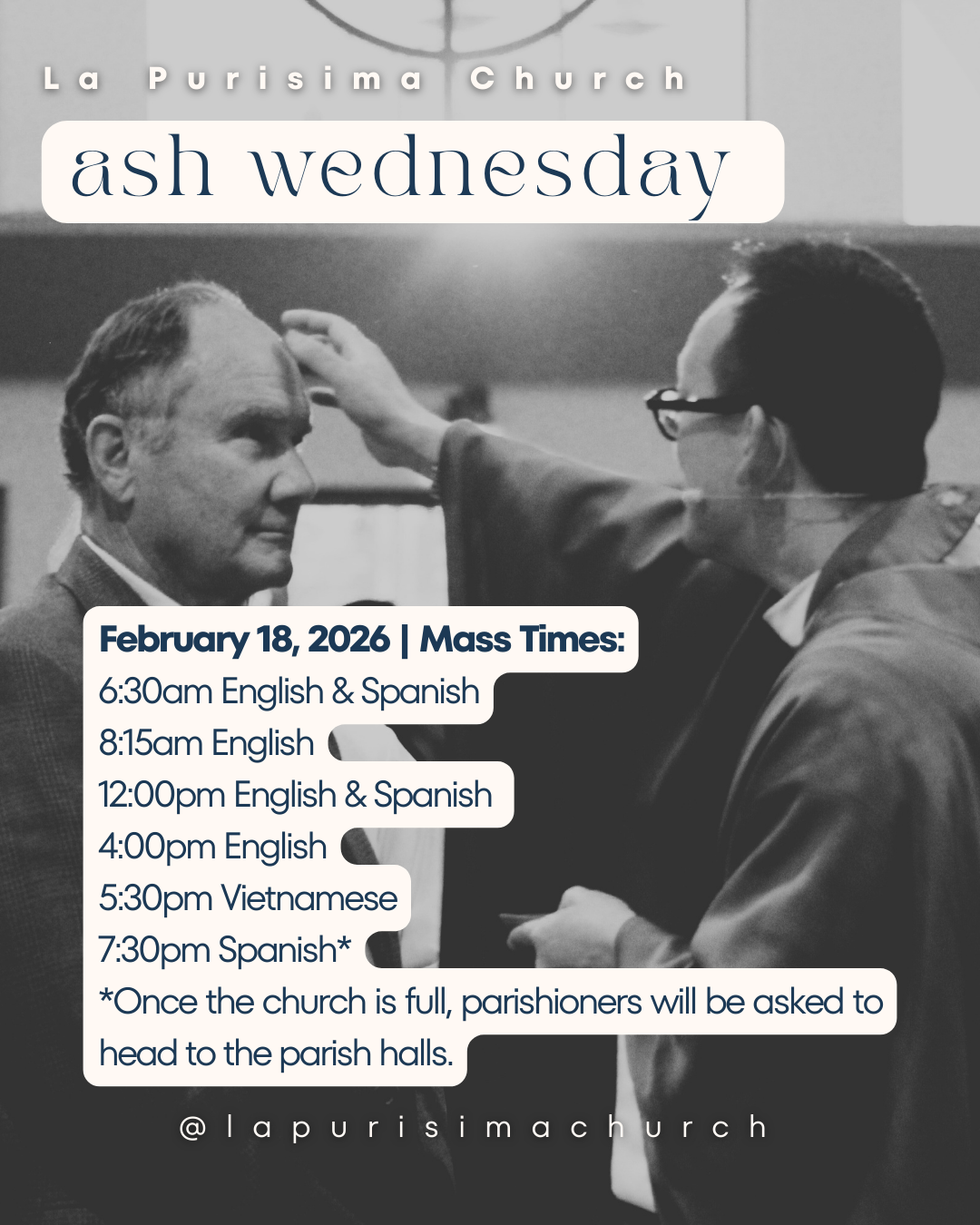 Home Events - La Purisima Catholic Church Lent Ash Wednesday Ash Wednesday + Add to Google Calendar + iCal / Outlook export 00 days 00 hours 00 minutes 00 seconds Date Feb 18 2026 Time All Day Location La Purisima Church 11712 Hewes St. Orange, CA 92869 Phone 7146335800 Category Lent Share this event