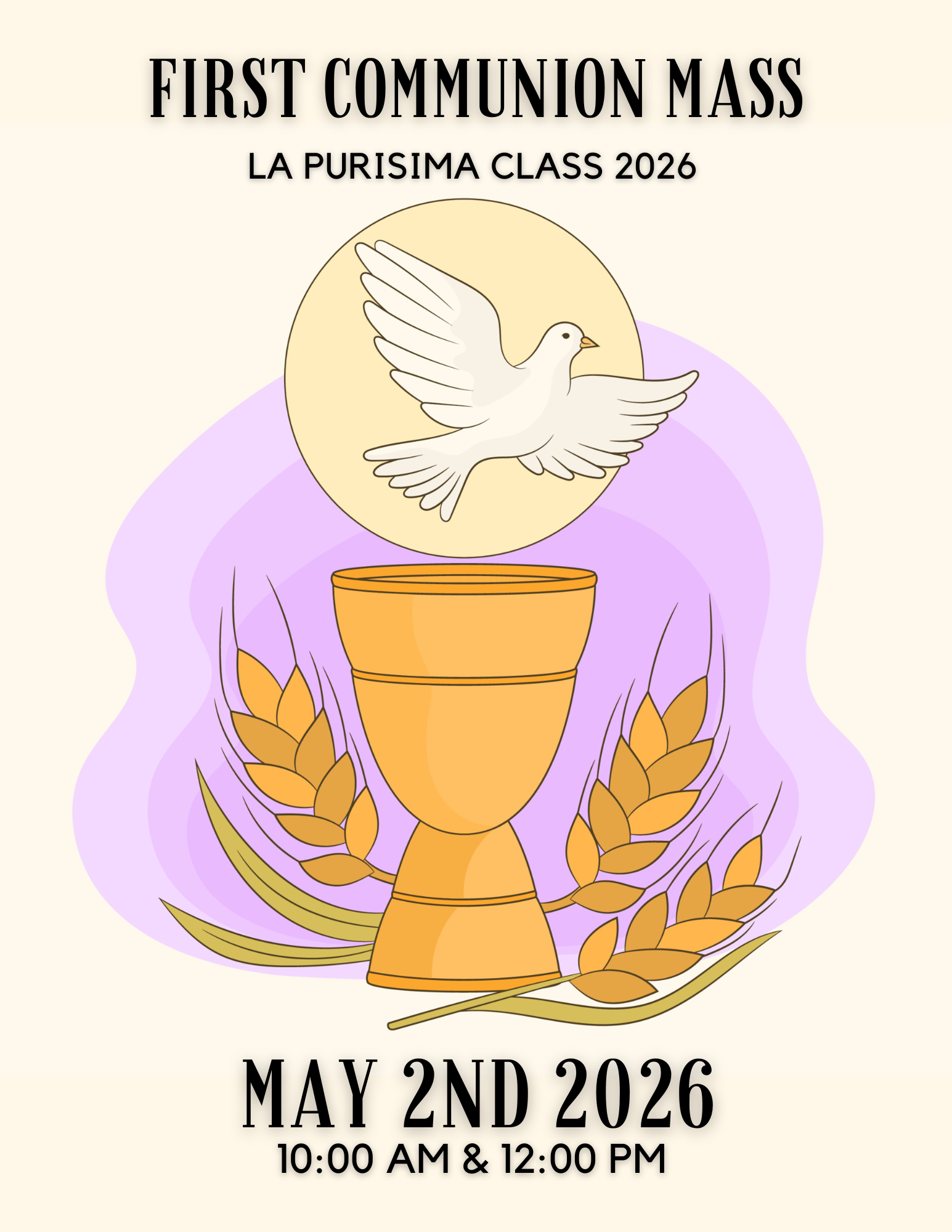 Home Events - La Purisima Catholic Church Faith Formation First Communion Mass First Communion Mass + Add to Google Calendar + iCal / Outlook export 00 days 00 hours 00 minutes 00 seconds Date May 02 2026 Time 10:00 am - 11:00 am Location Church 11712 N. Hewes st. Orange, CA 92869 Category Faith Formation Organizer Marlene Zambrano Phone 714-633-5800 ext 8513 Email [email protected] Share this event