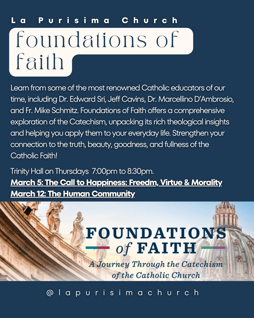 Home Events - La Purisima Catholic Church Continued Faith Formation Lent Foundations of Faith Foundations of Faith + Add to Google Calendar + iCal / Outlook export Date Mar 12 2026 Expired! Time 7:00 pm - 8:30 pm Category Continued Faith Formation Lent Share this event