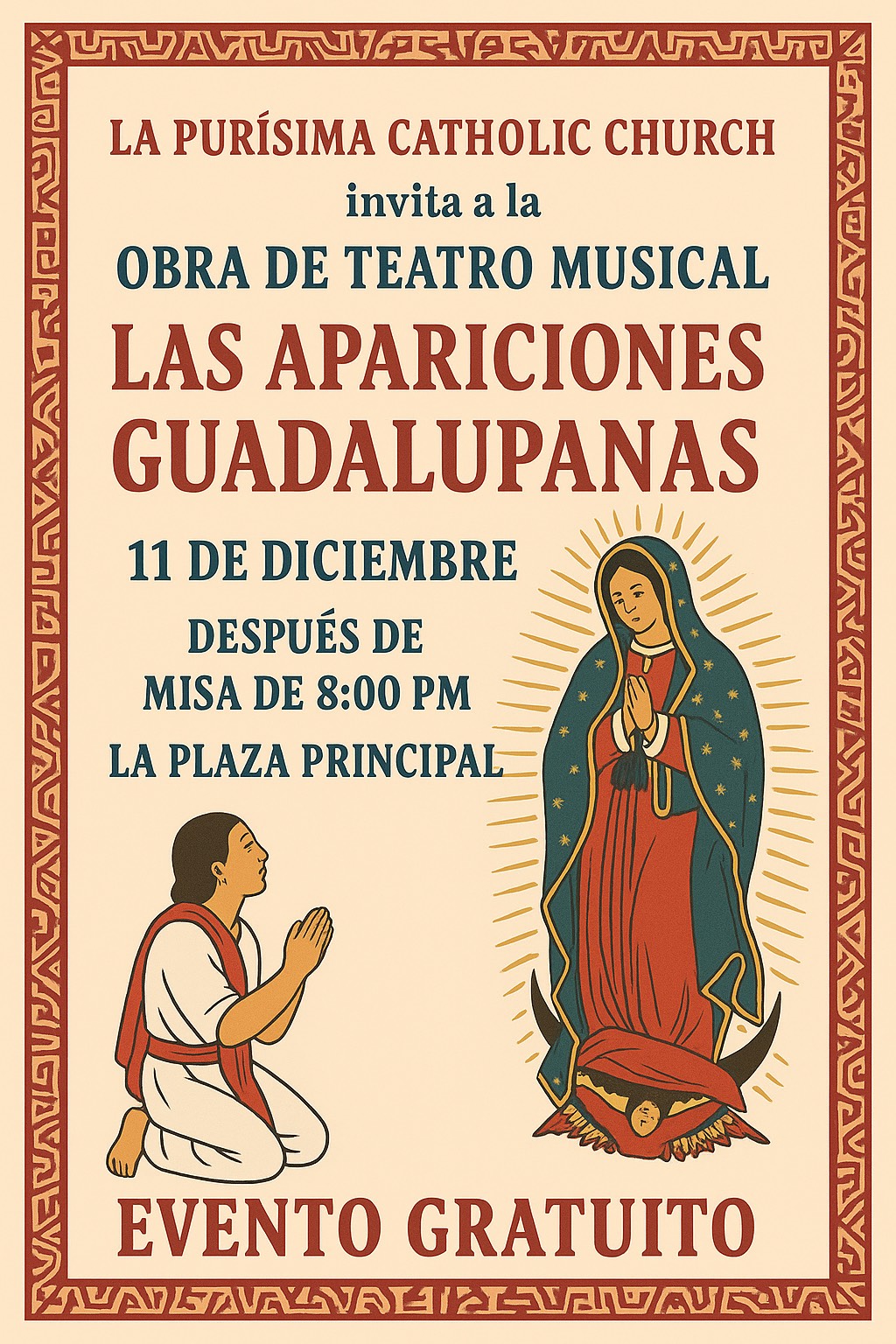 Home Events - La Purisima Catholic Church Advent Comunidad Hispana Las Apariciones Guadalupanas – Obra de Teatro Musical Las Apariciones Guadalupanas – Obra de Teatro Musical + Add to Google Calendar + iCal / Outlook export 00 days 00 hours 00 minutes 00 seconds Date Dec 11 2025 Time 9:00 pm - 10:00 pm Location Church Plaza Category Advent Comunidad Hispana Share this event