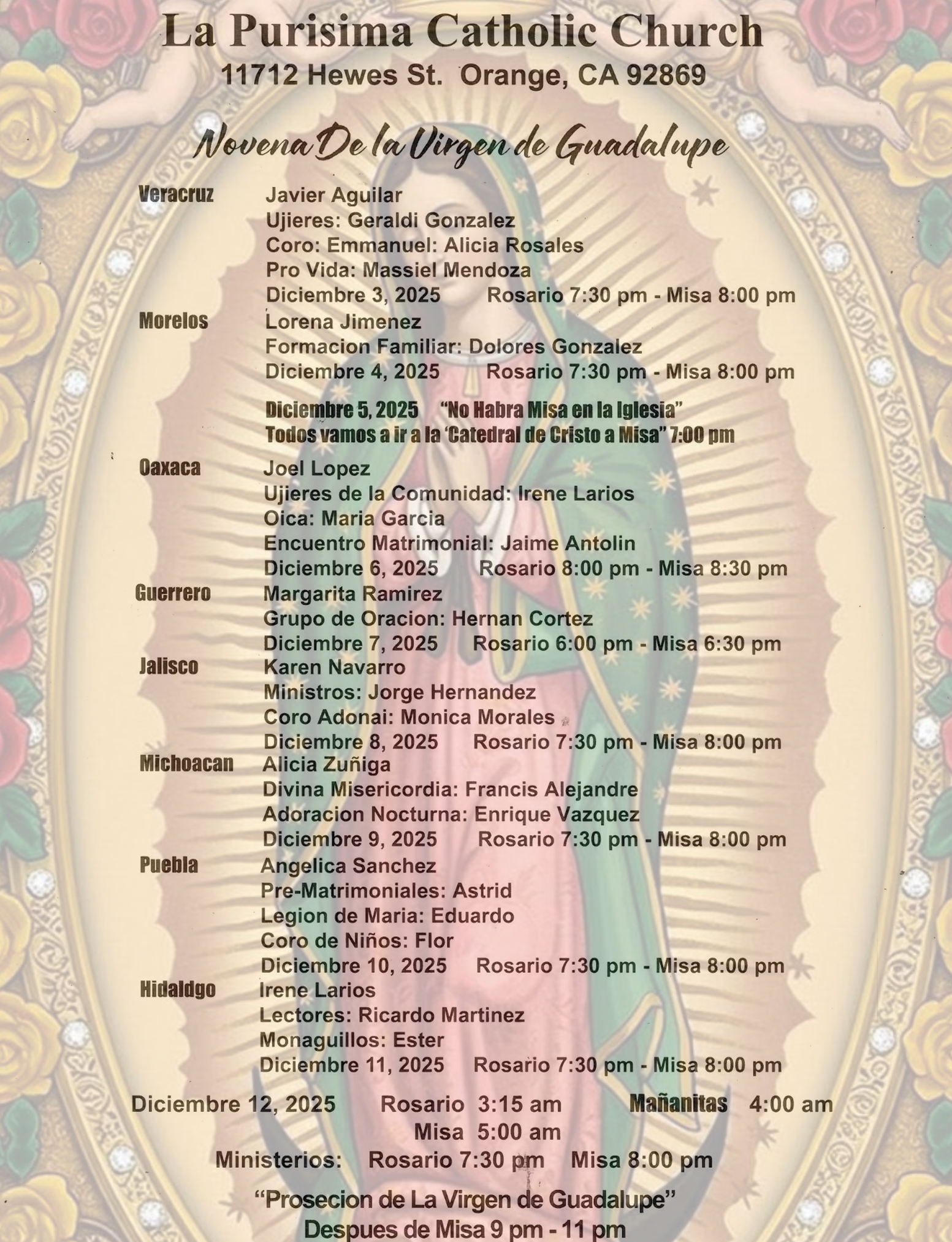 Home Events - La Purisima Catholic Church Comunidad Hispana Special Masses Novena de Nuestra Señora de Guadalupe Novena de Nuestra Señora de Guadalupe + Add to Google Calendar + iCal / Outlook export 00 days 00 hours 00 minutes 00 seconds Date Dec 11 2025 Time All Day Category Comunidad Hispana Special Masses Share this event